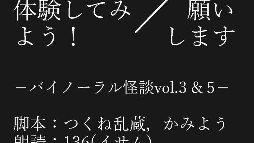 ・登録者13万人以上、総再生数2億回を超えるYouTubeチャンネル「怖い話 怪談 朗読」にて怪談朗読を行っている言霊堂の136(イサム)(X:@IsAM0136)による【バイノーラル怪談】第三&五弾登場(再生時間:8分25秒+6分32秒)